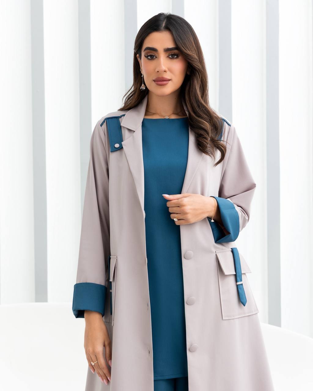 الطبقة الخارجية بقصّة مستقيمة وانسيابية تضيف لمسة راقية، وتنسّق بسلاسة مع التوب الداخلي والبنطال لخلق إطلالة متكاملة ومرتبة.